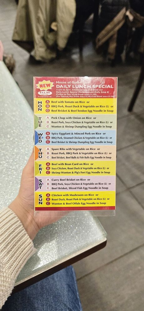 “ I found out that House of Gourmet is one of Simu Liu's favorite restaurants in Toronto, so naturally, my mom and I had to check it out. And honestly? We totally get it! We loved it so much we ended up coming back the very next weekend. We tried their $12.99 lunch special. You get to pick from three options: Option A is usually classic HK café comfort food, Option B has HK BBQ combos, and Option C is all about noodles. Each meal also comes with soup and a hot drink, which is honestly such a steal in today's economy. On our first visit (a Saturday), we tried the BBQ pork, and wow--it was so tender and flavorful without being overly sweet like some other HK BBQ places. The next weekend, we came back and tried their wontons. They were big and stuffed with shrimp, but I did notice the shrimp-to-pork ratio was a bit off (definitely more shrimp), so they were softer than I expected. Overall, it's easy to see why this place is such a favorite. The food is comforting, affordable, and just hits the spot. Next time you find yourself near Chinatown, this place should definitely be on your list! ”