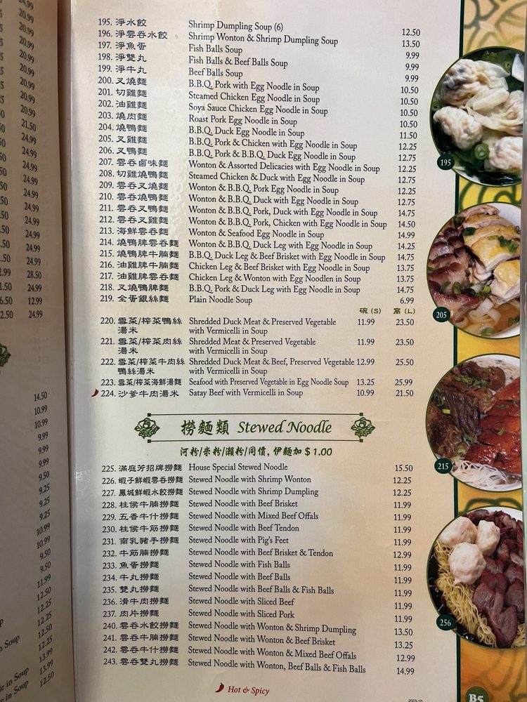 “ I came here twice during my trip to Toronto for their Shrimp Wonton with Egg Noodle in Soup ($10.99). The wonton here are huge, bouncy and juicy. They give you 5 per bowl, so I shared it with my husband. The egg noodles are cooked to perfectly al dente and have such a satisfying chew to them. We also ordered a beef chow fun and beef brisket with egg noodles. Both of these were good, but I would stick to the wonton with egg noodle. Delicious food at an absolute steal of a price. Honestly a great spot if you just want to sit, snack a bit and drink some tea as a quick break before hitting the road again. ”